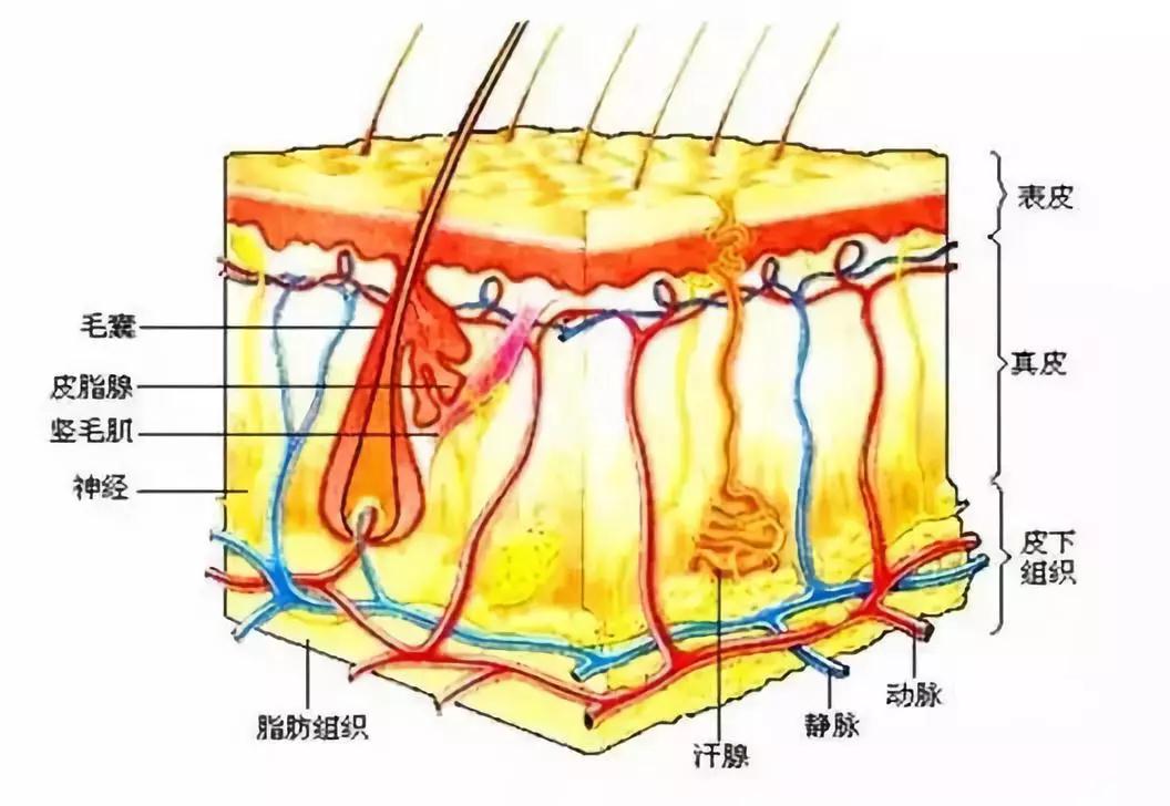 怕太专业你们会睡着,那简化来说—— 最下面的皮下组织其实就像肥沃的土壤一样,滋养整个真皮和表皮层,超级伟大,能量来源呢就是这一层的皮下脂肪,当然还有打酱油的毛囊。 然后真皮层,是个比较娇气的皮层,因为它没有再生能力,一旦受损,就很难修复: 里面有网状层和乳头层,包含血管,神经,淋巴管,汗腺和皮脂腺。乳头层和网状层就是保持皮肤弹性,皮脂腺和汗腺就是平衡肌肤的水油。 好了,重点来了,这一层有一个毛细血管,主要是把动脉和静脉连接起来。(如果你有红血丝,最好仔细看看它们)